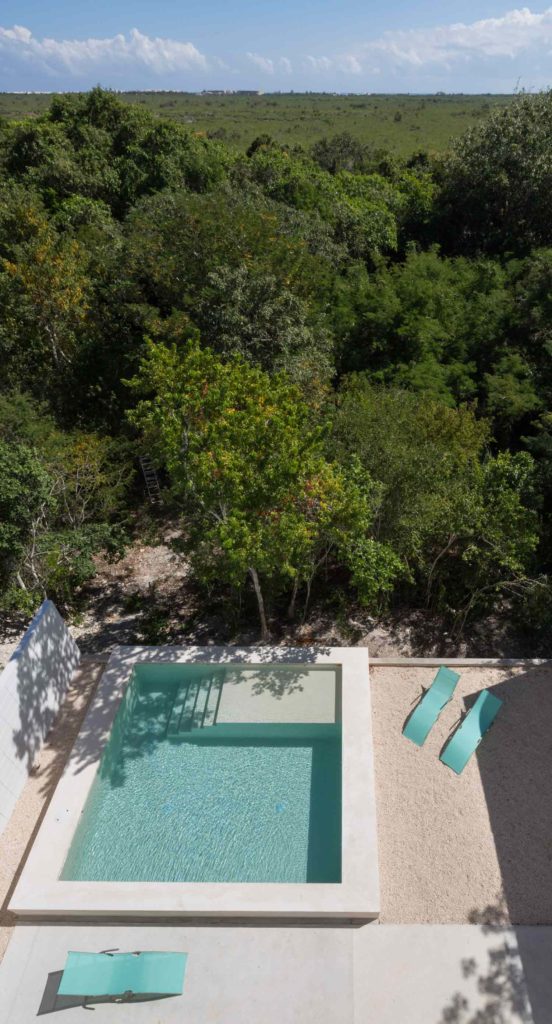 El espacio doméstico de la casa se construye alrededor de una escalera que cualifica el espacio central de la vivienda y articula el carácter necesariamente vertical de la construcción. La escultural escalera sirve de telón de fondo a la sala, un espacio diáfano cuya altura y proporciones lo convierte claramente en el espacio principal y nodal de la casa. Éste, se abre hacia el jardín, y a hacia la frondosa vegetación. La casa se cierra por completo hacia la orientación sur, que es donde está la calle, y donde el sol se hace casi insoportable en estas latitudes. La escalera se apoya sobre esta fachada, y funciona como la espina dorsal posterior que organiza la casa, distribuyendo hacia todas las estancias que se abren hacia el norte y las vistas del manglar y el mar. Las habitaciones, ubicadas en la parte alta de la casa, son diáfanas y sencillas, con su propio baño y con la sola premisa de orientar la cama a las vistas y dotarlas siempre de una gran terraza para poder beneficiarse de la vida en el exterior. De esta manera, la fachada sur de la casa es dura, cerrada y opaca, siendo la fachada norte más permeable y dúctil.