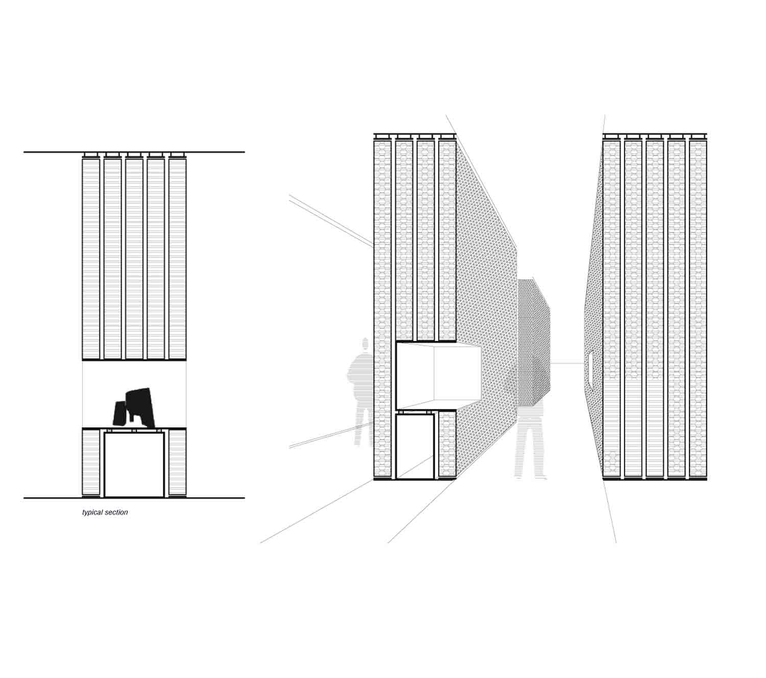 Con los condicionantes tecnológicos y técnicos que supone la elección de este papel, se diseñan unos módulos cuyas dimensiones vienen definidas por sus soportes superior e inferior, que son las puertas estándares de dimensiones mínimas. Así, en cada módulo se agrupan 5 tiras de papel reciclado blanco de abeja, creando gruesas paredes donde se insertan las vitrinas. Éstas, intensamente blancas se leen como marcos suspendidos en el papel, encuadrando y acentuando la tectonicidad de las piezas.